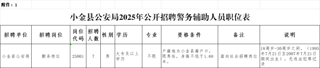 附件:1.小金县公安局2025年公开招聘警务辅助人员职位表