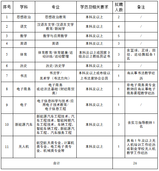达州市职业高级中学是达州市人民政府举办的一所公办中等职业学校,达州市教育局直属管理,市本级财政保障。是全国首批国家级重点中等职业学校,四川省中职示范校,四川省中职“三名工程”四星建设学校,四川省“依法治校”示范校。因发展需要,学校现面向社会公开招聘以下岗位临聘教师: