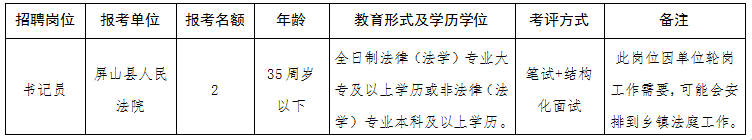 (一)基本条件1.具有中华人民共和国国籍;2.拥护中华人民共和国宪法,拥护中国共产党的领导和社会主义制度;3.具有良好的政治素养、专业能力和职业操守;4.具有正常履行职责的身体条件和心理素质;5.年龄在18周岁及以上,35周岁及以下(时间计算到公告发布之日),具有符合聘用职位要求的文化程度、工作能力和其他资格条件;6.遵纪守法、品行端正。凡有下列情形之一的,不得报名:1.受过刑事、治安处罚的人员;2.受过党纪、政务处分的人员;3.曾被开除公职、开除中国共产党党籍或被法院、检察院辞退的人员;4.现役军人;5.全日制在校学生(应届毕业生除外);6.被依法列为失信联合惩戒对象的人员;7.有其他不适宜担任法院编外聘用人员情形的人员。(二)招聘职位及条件聘用书记员岗位(2名):1.具有全日制法律(法学)专业大专及以上学历或非法律(法学)专业本科及以上学历;2.掌握计算机及软件使用等必备的办公办案技能,具有较高的文字录入水平和一定的逻辑分析能力、法律思辨能力和文稿写作能力。四招聘程序