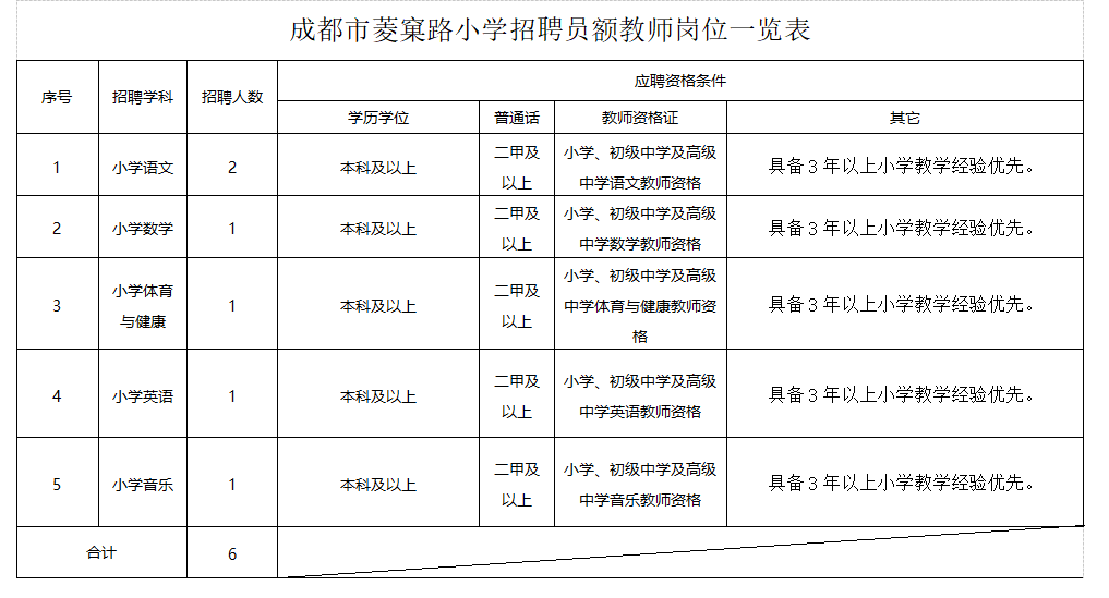 本次招聘员额教师共计6名(招聘岗位详见《成都市菱窠路小学招聘员额教师岗位一览表》)。