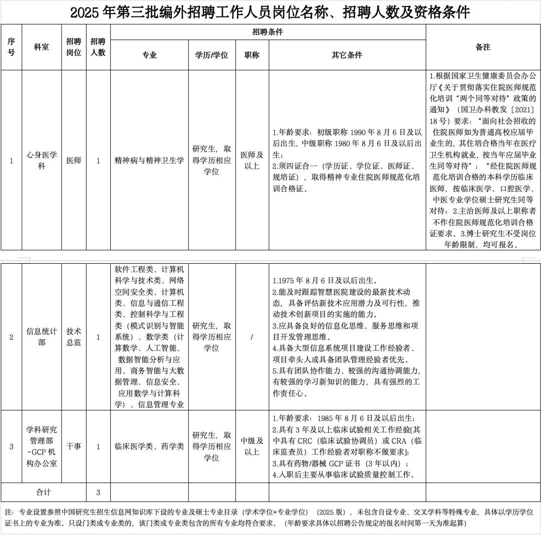 共计招聘3名。具体岗位和条件见附表《2025年第三批编外招聘工作人员岗位名称、招聘人数及资格条件》。四、报名时间及方式
