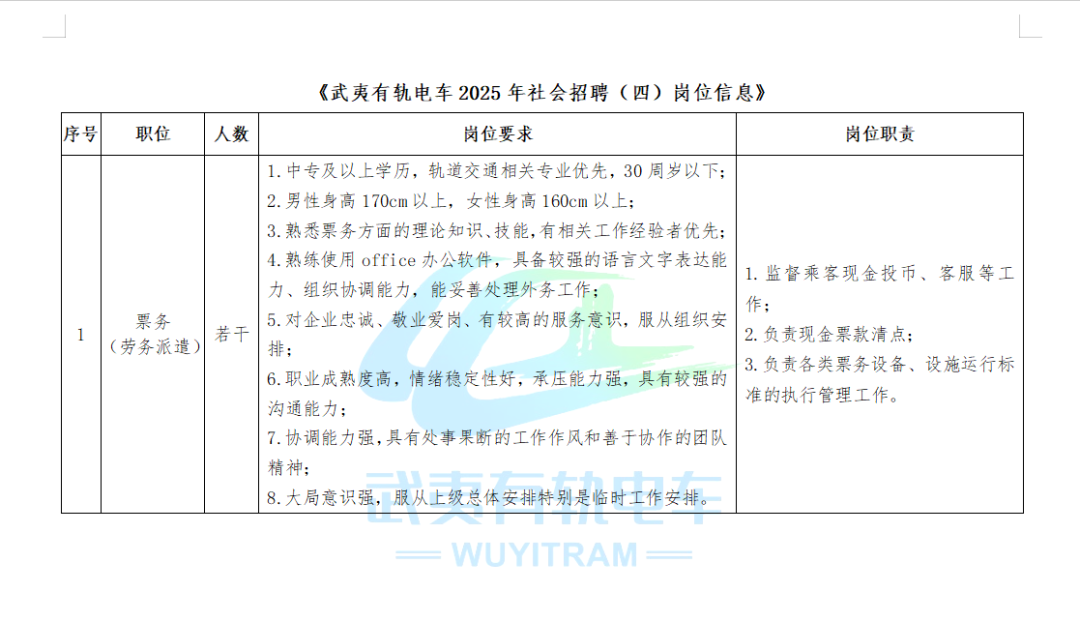 具体招聘职位信息详见附件《武夷有轨电车2025年社会招聘(四)岗位信息》。