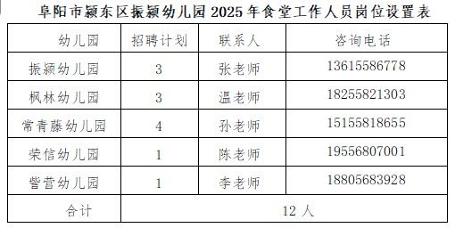 阜阳市颍东区振颍幼儿园2025年招聘派遣制幼儿教师10名,派遣制食堂工作人员12人(岗位设置见下图)。
