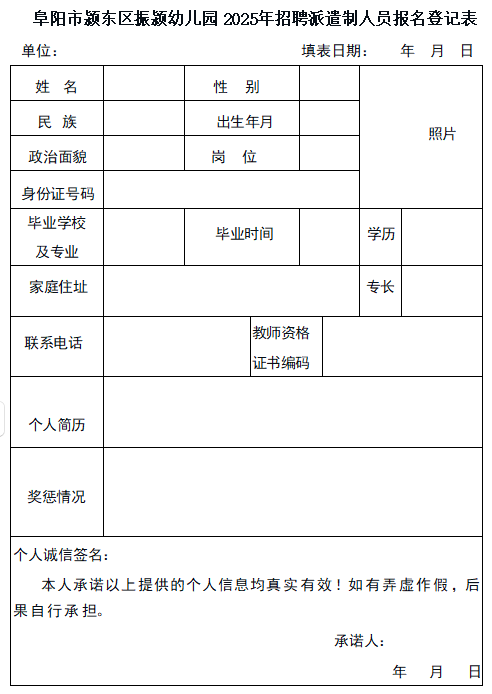 附件:阜阳市颍东区振颍幼儿园2025年招聘派遣制人员报名登记表(扫码获取)