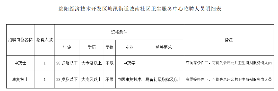 根据我中心实际工作需求,需招聘2名临聘工作人员。参照《绵阳市2022年公共卫生特别服务岗项目实施方案》文件,在同等条件下,可优先录用公共卫生特别服务岗人员。