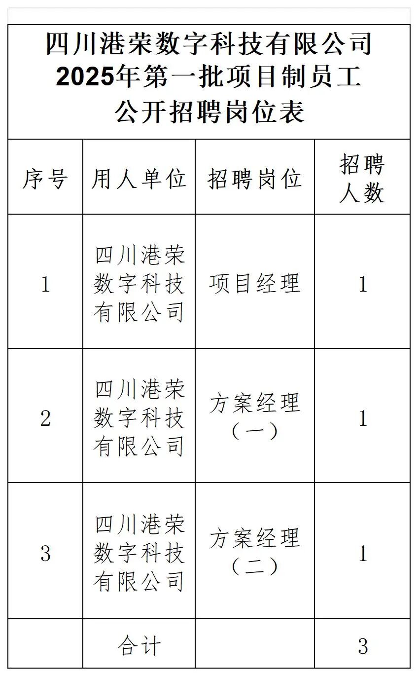 本次招聘3名工作人员,招聘岗位、职责以及任职条件详情见附件:《四川港荣数字科技有限公司2025年第一批项目制员工公开招聘岗位表》。
