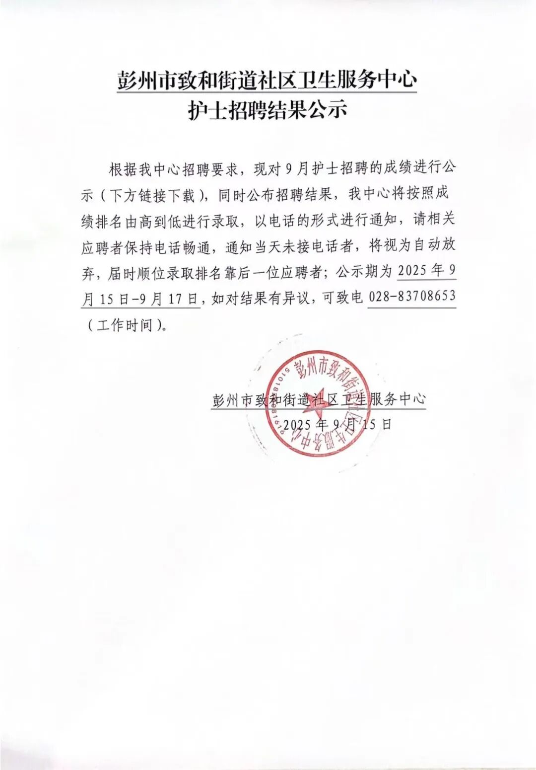 彭州市致和街道社区卫生服务中心护士招聘结果公示