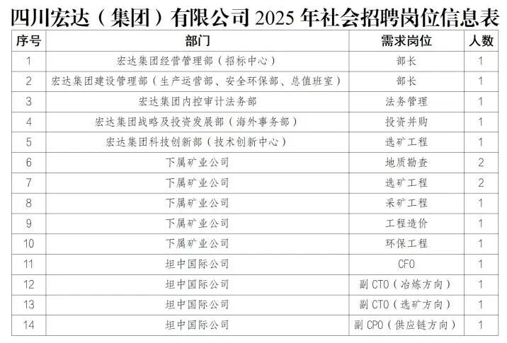 本次社会招聘共计16人,具体岗位设置、任职要求及数量见文末附件1:《四川宏达(集团)有限公司2025年社会招聘岗位信息表》。