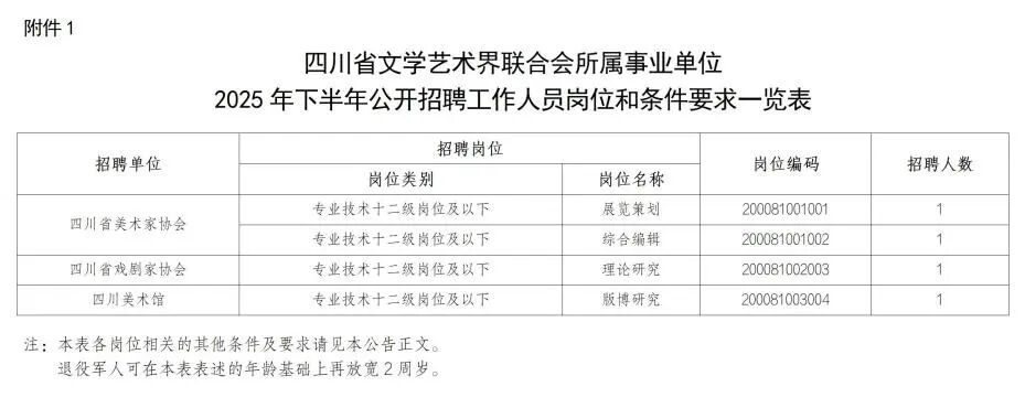 具体岗位和条件详见文末附件1:《四川省文学艺术界联合会所属事业单位2025年下半年公开招聘工作人员岗位和条件要求一览表》。
