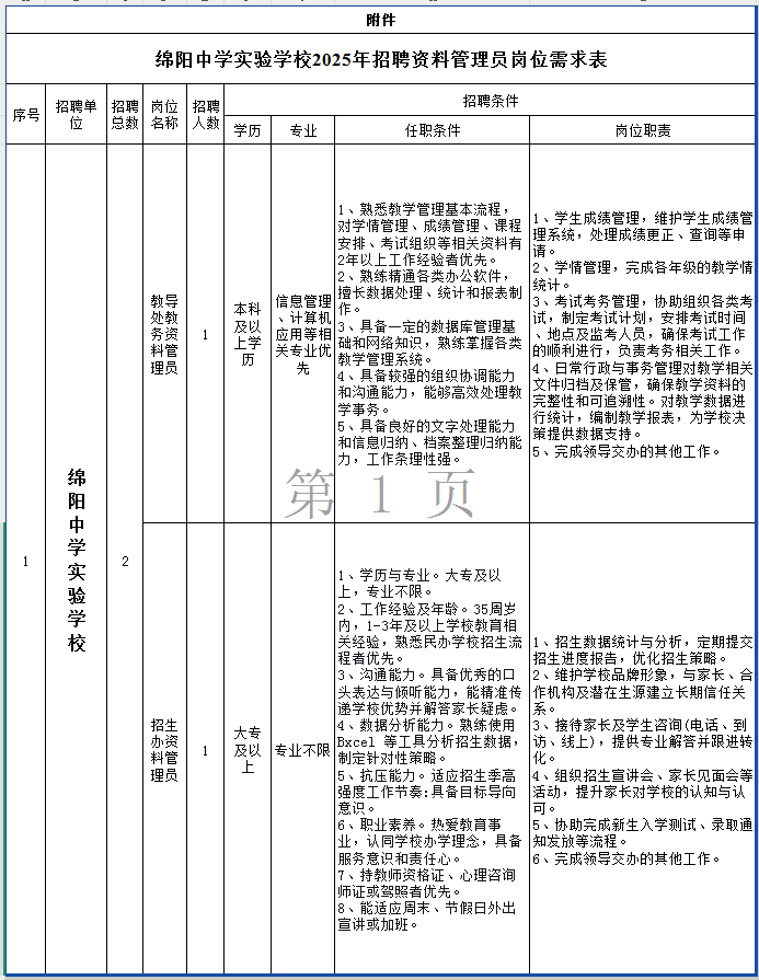 详见附件《绵阳中学实验学校2025年招聘资料管理员岗位需求表》。