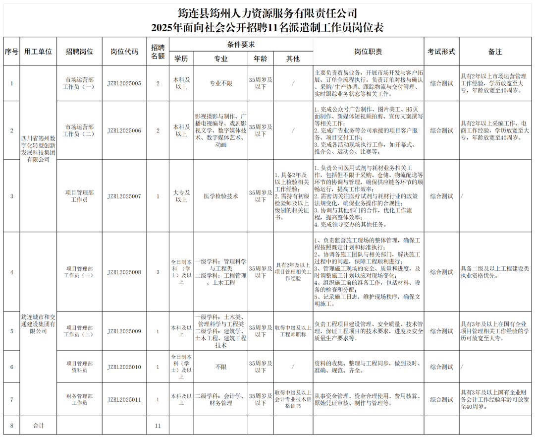 本次面向社会公开招聘11名派遣制工作员,由筠州人力公司派遣至筠州数创集团工作,具体的招聘岗位、招聘名额及条件要求等情况详见附件1(《筠连县筠州人力资源服务有限责任公司2025年面向社会公开招聘11名派遣制工作员岗位表》,以下简称《岗位表》)。