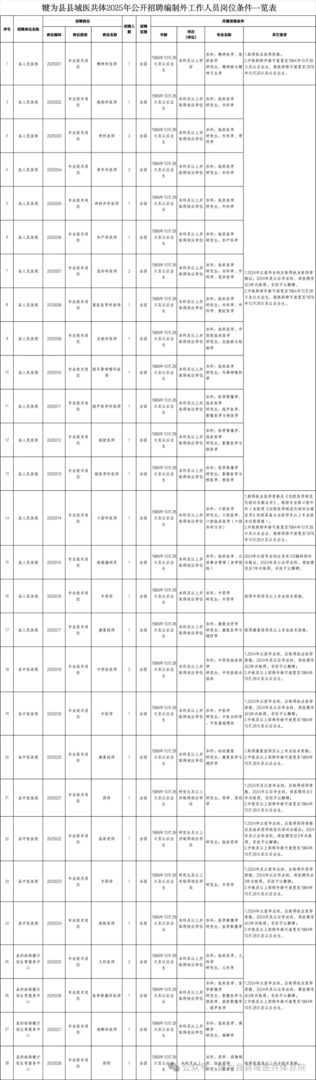 符合《犍为县县域医共体2025年公开招聘编制外工作人员岗位和条件要求一览表》(附件1,以下简称《一览表》)所需资格条件要求的人员,其中,2025年规培结业生须提供住院医师规范化培训合格证书或住院医师规范化培训结业考试合格证明。