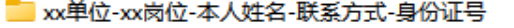 以上报名材料按照“序号+文件名称”格式命名,文件夹按照“报考单位-岗位名称-本人姓名-联系方式-身份证号”格式命名后打包压缩发送,可参考下图,报名资料未按照要求提交的视为报名无效。