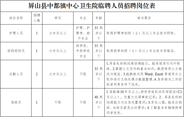 为满足我院业务发展需要,屏山县中都镇中心卫生院现面向社会公开招聘相关岗位工作人员。现将有关事项公告如下:
