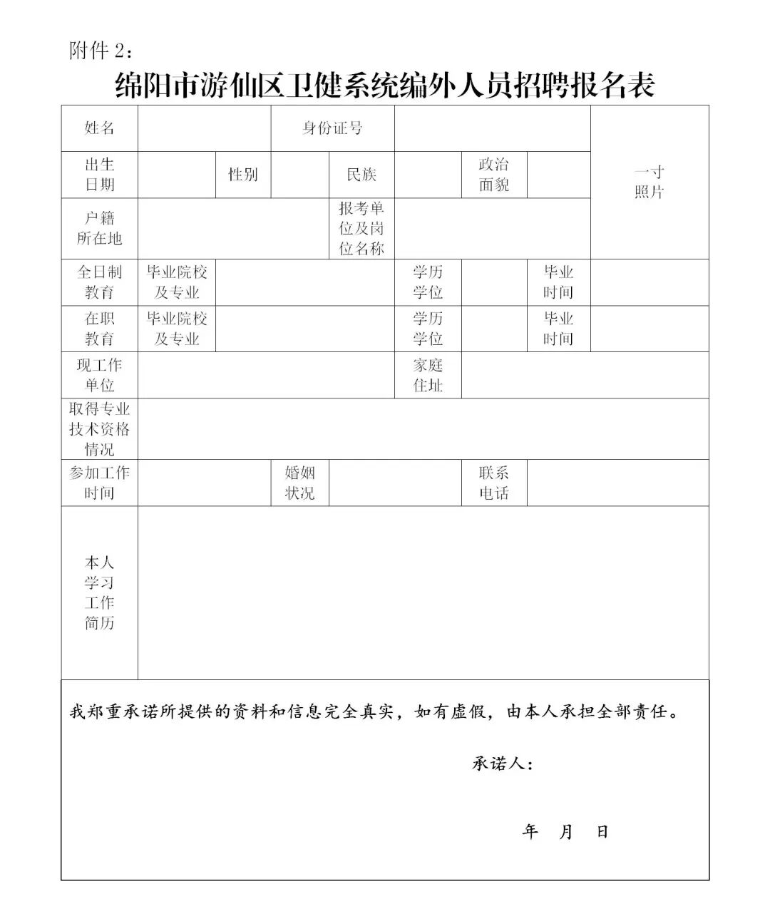 (1)《绵阳市游仙区卫健系统编外人员招聘报名表》1份,近期免冠一寸彩照2张;