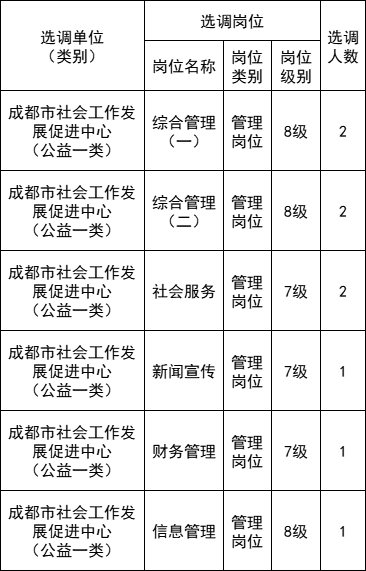 因工作需要,中共成都市委社会工作部所属事业单位面向成都市范围内的在编在岗事业单位工作人员、公务员(含参照公务员法管理单位工作人员)公开选调工作人员9名。根据《四川省事业单位工作人员流(调)动试行办法》《成都市事业单位工作人员流(调)动试行办法》等有关规定,现将有关事项公告如下: