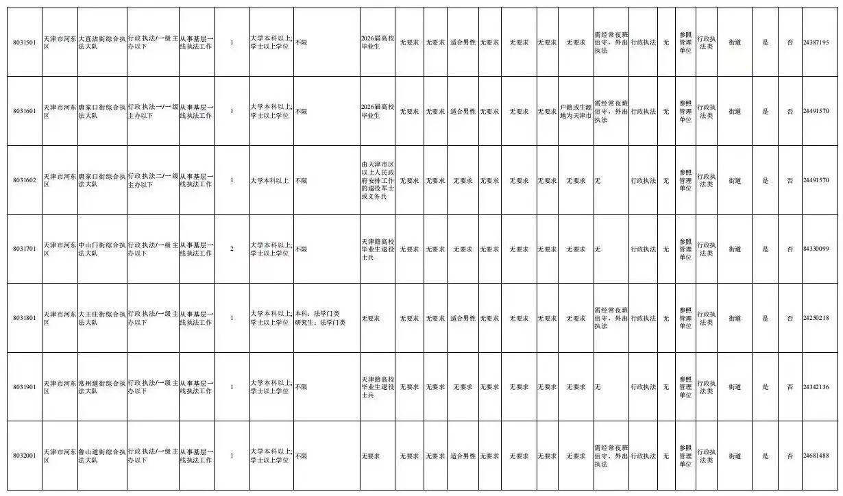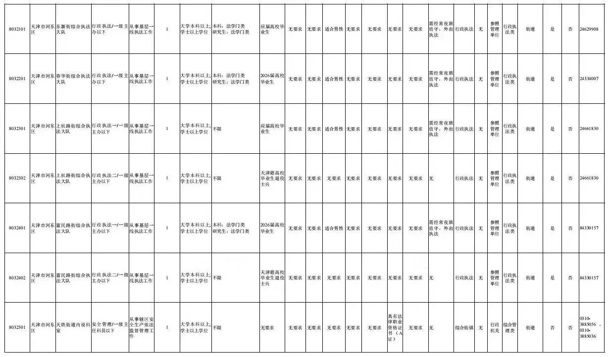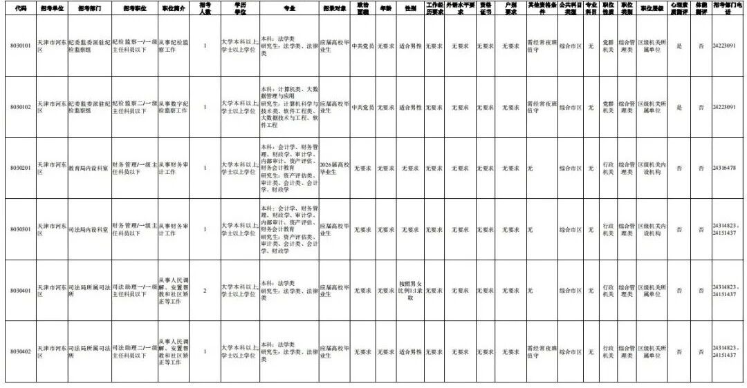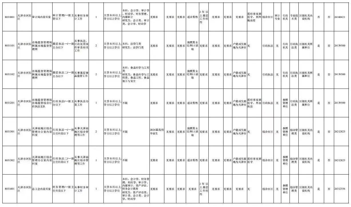 天津市河东区2026年度考试录用公务员职位表