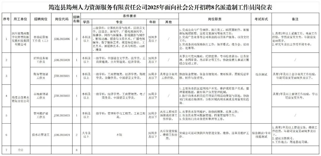 本次面向社会公开招聘8名派遣制工作员,由筠州人力公司派遣至筠州数创集团、自来水公司工作,具体的招聘岗位、招聘名额及条件要求等情况详见附件1(《筠连县筠州人力资源服务有限责任公司2025年面向社会公开招聘8名派遣制工作员岗位表》,以下简称《岗位表》)。