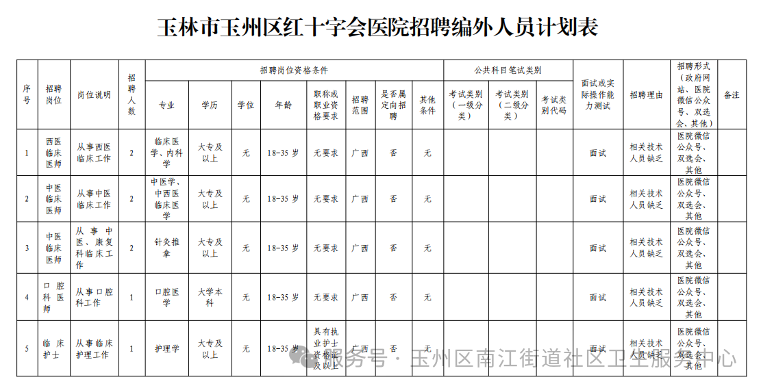 7.学历、专业及其他任职要求详见玉林市玉州区红十字会医院聘编外人员计划表。
