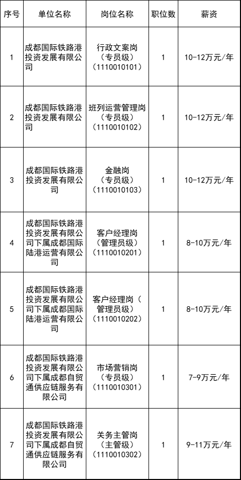 根据成都国际铁路港投资发展有限公司业务发展需要,按照“公开、平等、择优”原则,现面向社会公开招聘7名工作人员。具体公告如下: