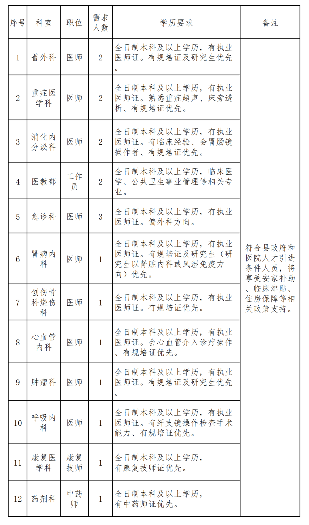 六、待遇基本工资、绩效根据医院相关规定发放(符合人才引进人员,按医院《人才引进管理办法》相关规定发放相应待遇)。试用期2个月,试用期满经考核合格者,医院与其签订劳动合同,并按规定购买五险一金。标签: 筠连县人民医院招聘公告 筠连县人民医院 医院招聘 招聘公告 医疗招聘