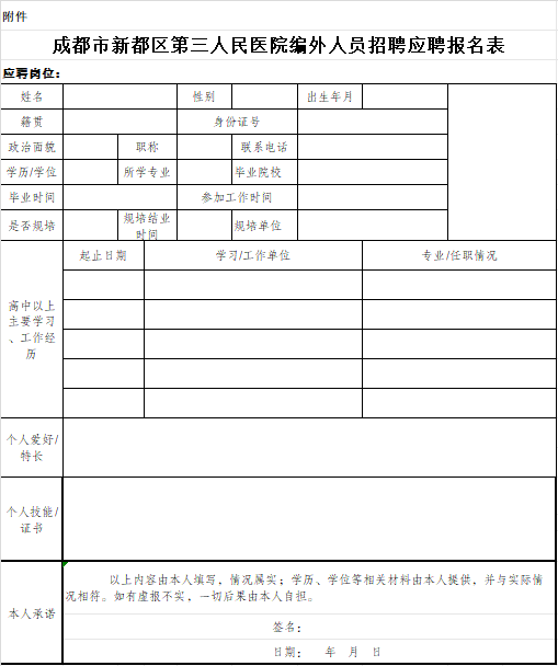区三医院编外人员招聘应聘报名表.xlsx标签: 成都市新都区第三人民医院 2025年第四季度招聘 自主招聘 编外专业技术人员 医院招聘公告