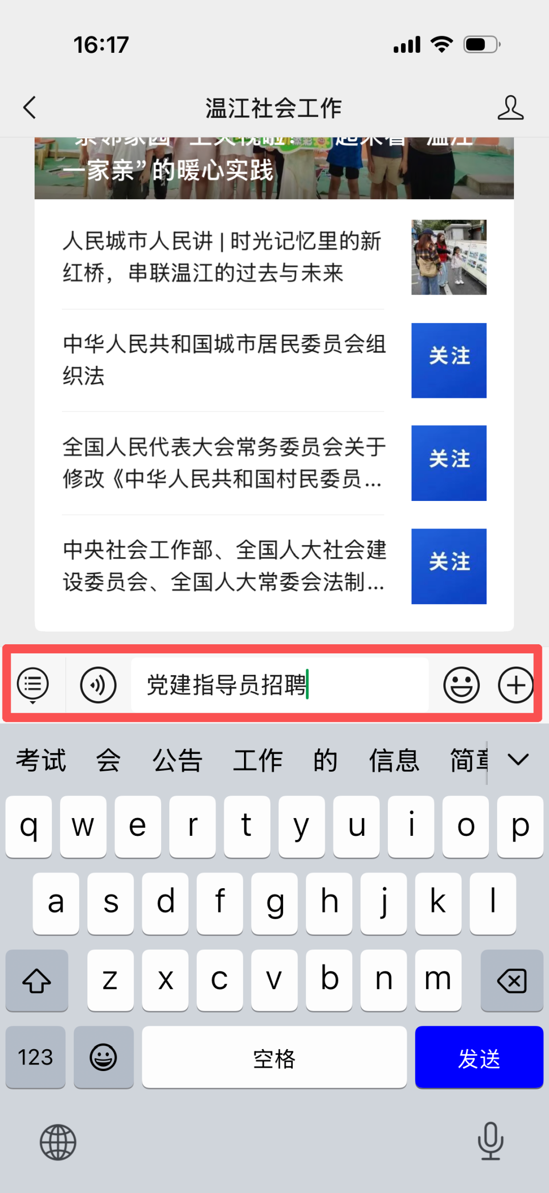 二、在“温江社会工作”微信公众号对话框输入关键词“党建指导员招聘”即可领取表格。具体操作请下滑↓