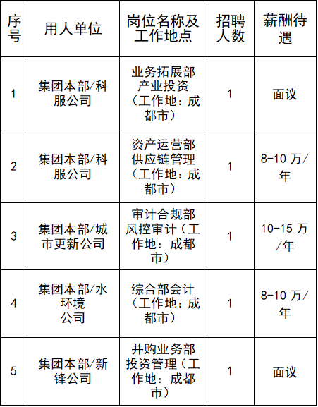 本次共计招聘5个岗位5名员工,涉及产业投资、供应链管理、风控审计、会计、投资管理岗位,具体岗位信息及有关任职要求详见《附件:成都天府国际生物城发展集团有限公司关于2025年招聘产业投资等岗位信息表》。