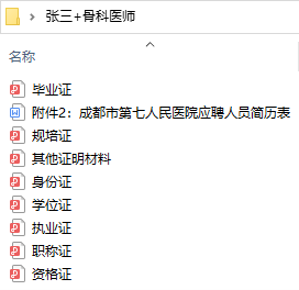 (2)下载并填写《成都市第七人民医院应聘人员简历表》(附件2),并将岗位条件要求的证书资料,如身份证、学历学位证、医师资格证和执业证、专业技术资格证(职称证)、住院医师规范化培训合格证书等扫描或拍照,与《应聘人员简历表》以压缩文件(zip或rar)形式发送到邮箱3463147273@qq.com(邮件主题请以“姓名+应聘岗位”命名,证明材料请备注命名,如“身份证照片”)。