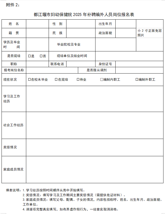 2.《都江堰市妇幼保健院2025年补聘编外人员岗位报名表》