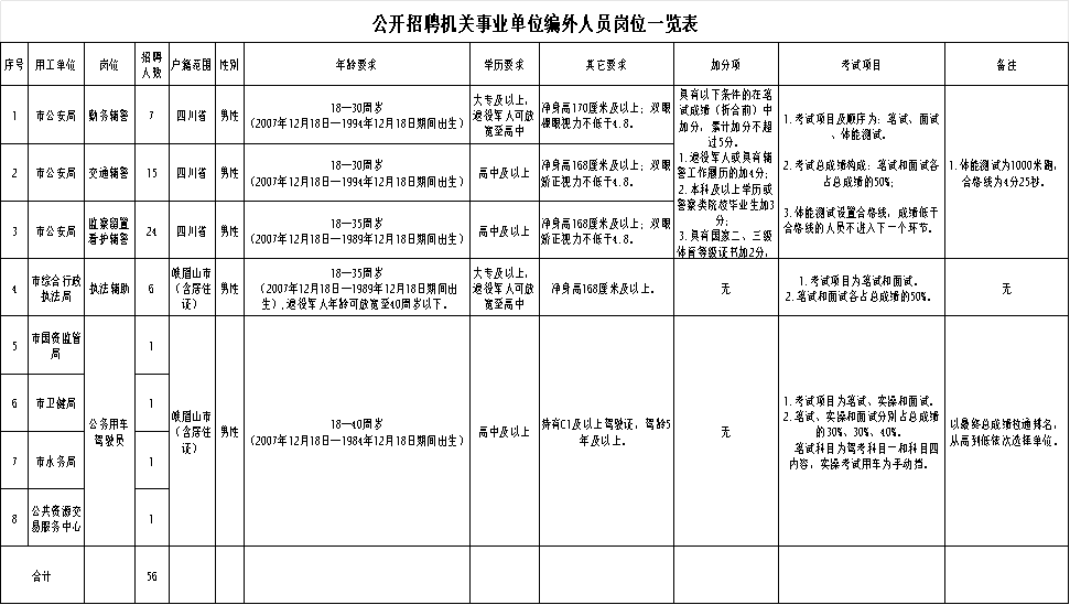 受峨眉山市人力资源和社会保障局委托,峨眉山市新世纪人才教育投资有限公司(以下简称新世纪人才公司)决定面向社会公开招聘56名机关事业单位编外人员(公安辅警类、综合辅助执法类、公务用车驾驶员),用工性质为劳务派遣。现将有关事项公告如下: