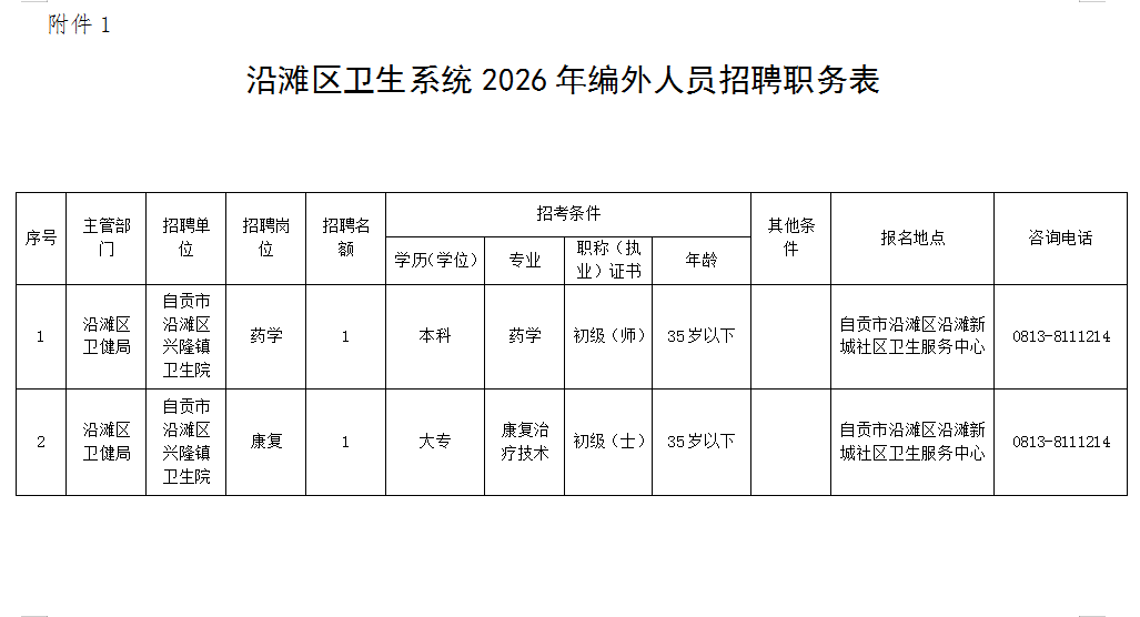 附件:1.沿滩区卫生系统2026年编外人员招聘职务表