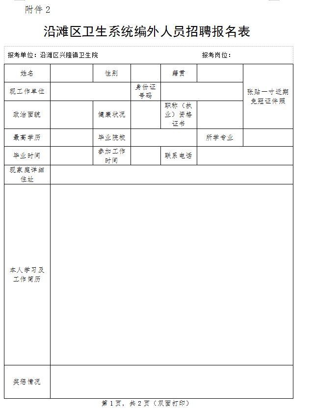 2.沿滩区兴隆镇卫生院2026年面向社会公开考核招聘事业单位编外工作人员报名表