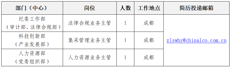 详见《中铝数为(成都)科技有限责任公司2026年面向中铝集团内部招聘岗位一览表(第一批)》(附件1)。