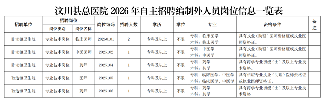 《岗位信息一览表》“专业”一栏要求的均为具体专业,不包括门类、学科类、专业类。资格条件中的“执业医师(助理)医师资格证”“临床医学检验技术专业初级(士)及以上专业技术资格 ”“药学专业初级(士)及以上专业技术资格 ”,取得时间截至2026年1月28日。