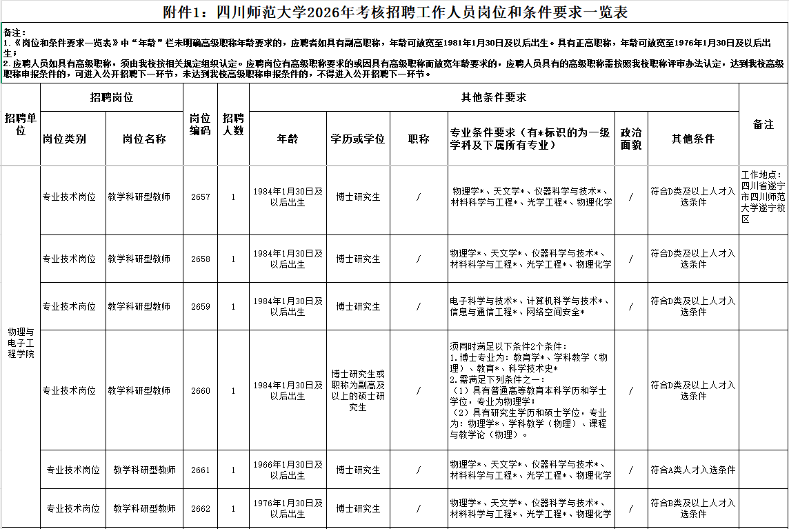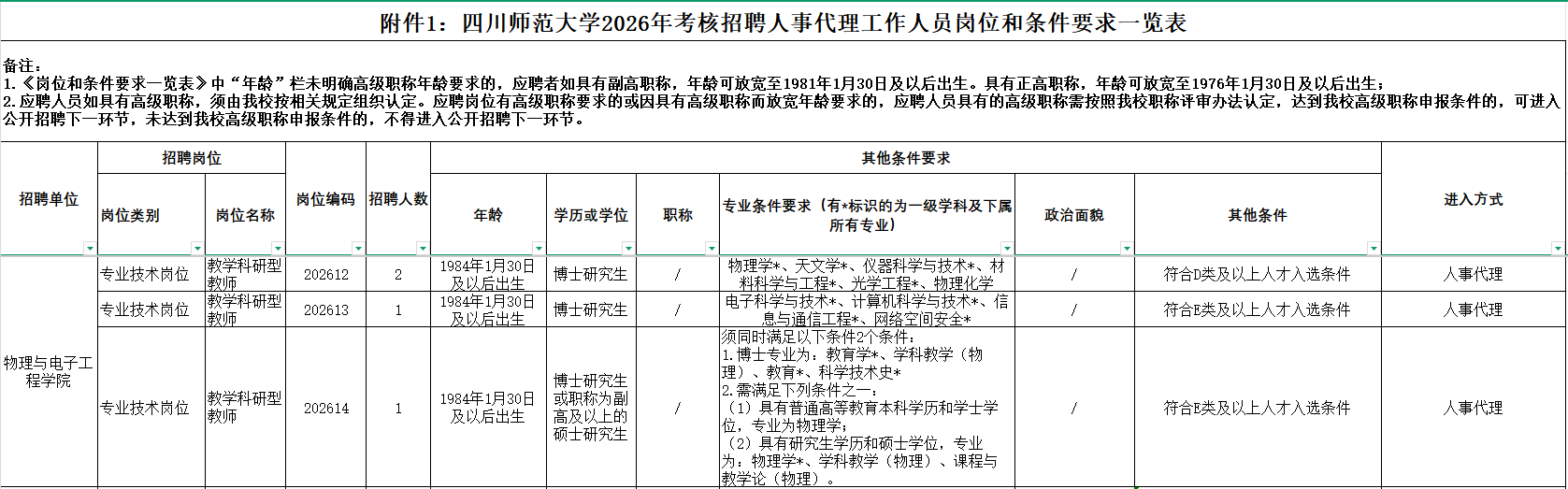 详见:四川师范大学2026年公开考核招聘事业单位工作人员公告 (sicnu.edu.cn)