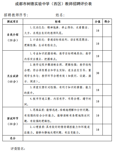 附件:成都市树德实验中学(西区)教师招聘评价表