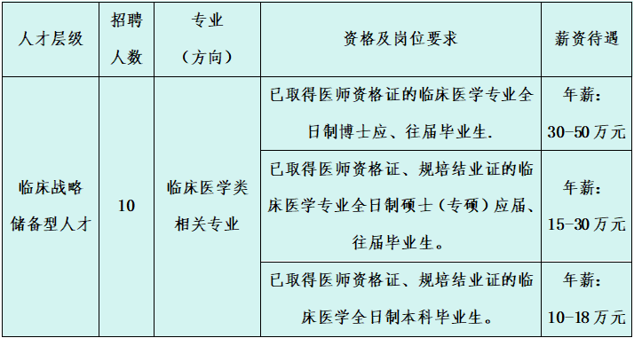 (二)临床战略储备型人才视具体情况可享“人才激励金”:本科5-10万,硕士15-30万,博士20-50万。