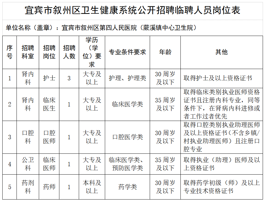 根据宜宾市叙州区第四人民医院业务发展需要,特面向社会公开招聘编外专业技术人员7名,现将有关事项公告如下: