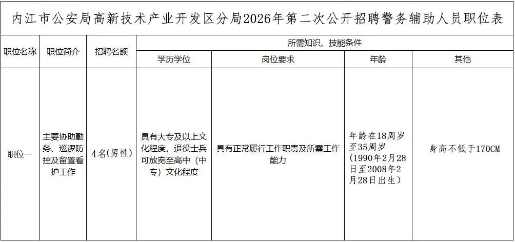 根据工作需要,按照《四川省公安机关警务辅助人员管理办法》《内江市公安机关警务辅助人员使用管理办法》《内江市公安机关警务辅助人员招聘办法》等规定,遵循公开、平等、竞争、择优的原则,内江市公安局高新技术产业开发区分局决定面向社会招聘警务辅助人员。现将有关事项公告如下: