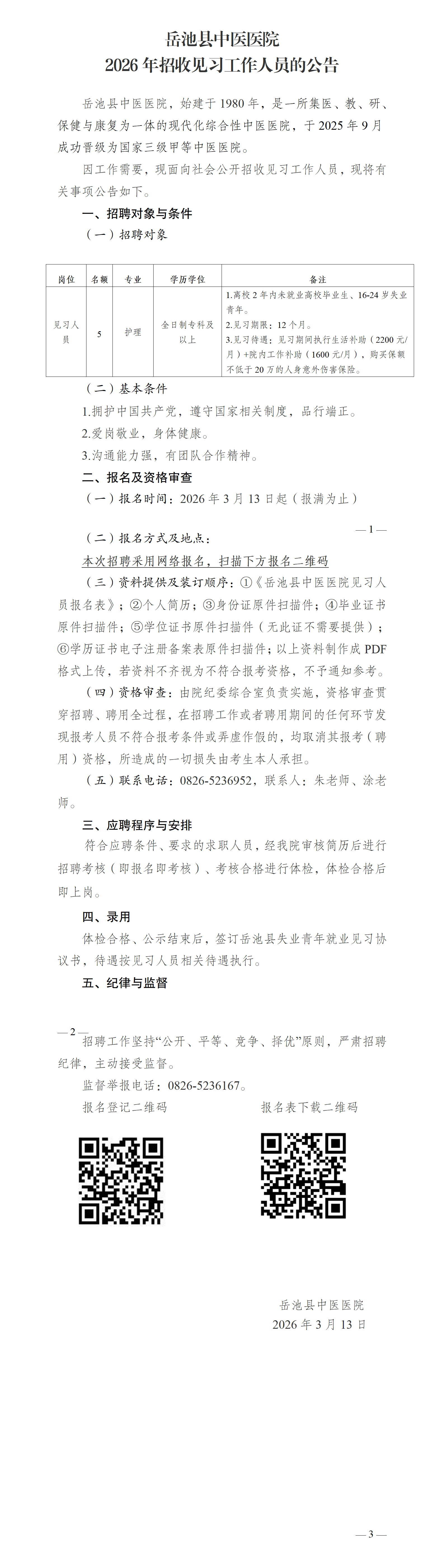 岳池县中医医院2026年招收见习工作人员的公告