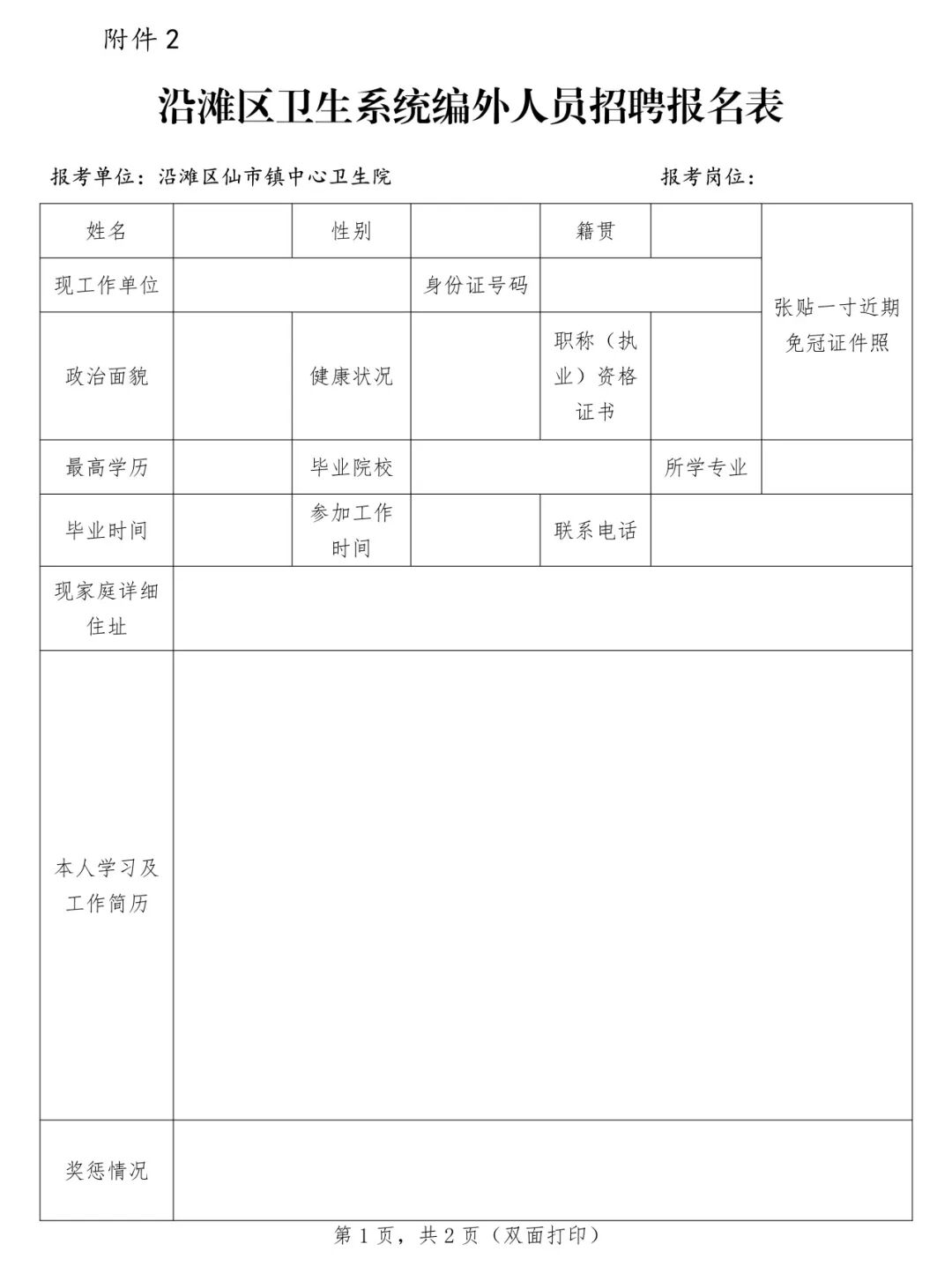 2.沿滩区仙市镇中心卫生院2026年面向社会公开考核招聘事业单位编外工作人员报名表