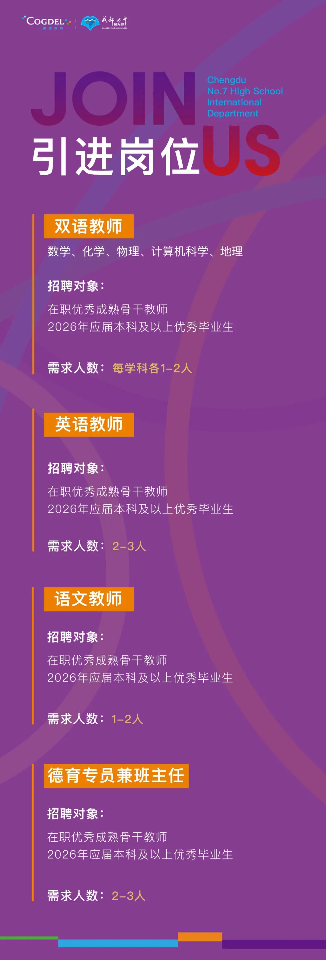 如有意向,请将您的简历投递至成都七中国际部人事部招聘邮箱,并将简历附件命名为:姓名+应聘职位+来源渠道。