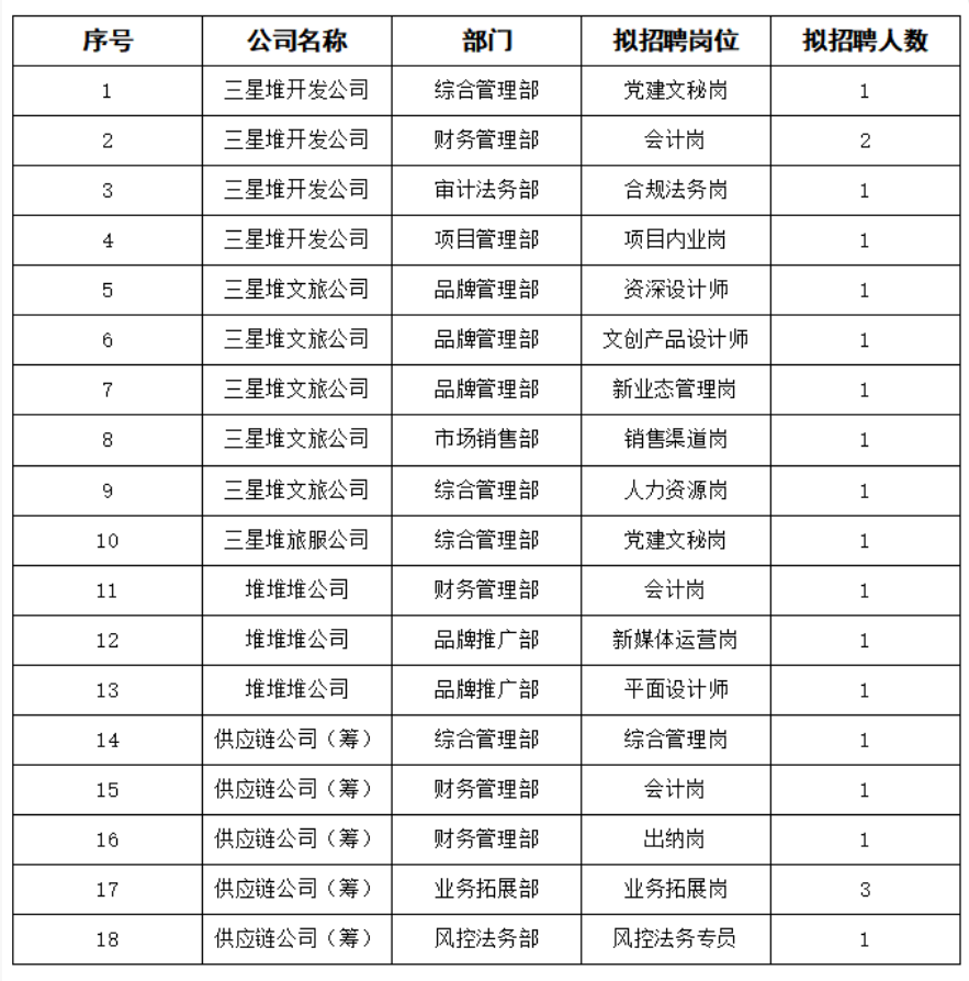 招聘岗位及名额如下表所示,岗位要求详见附件1《三星堆开发建设有限公司及下属子公司2026年第一次面向社会公开招聘岗位表》(以下简称岗位表)。
