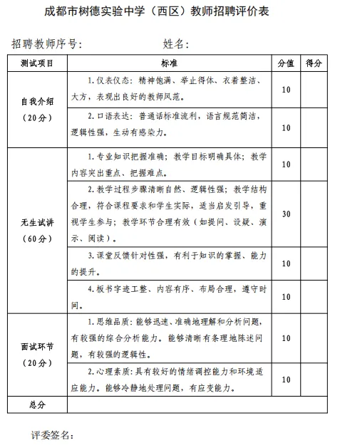 附件1:成都市树德实验中学(西区)教师招聘评价表