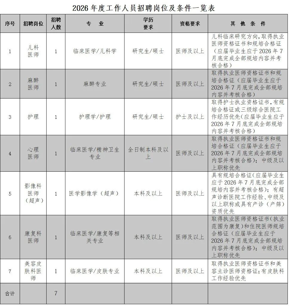 本次面向社会公开招聘儿科医师等7个岗位共7名工作人员(见文末附件)。