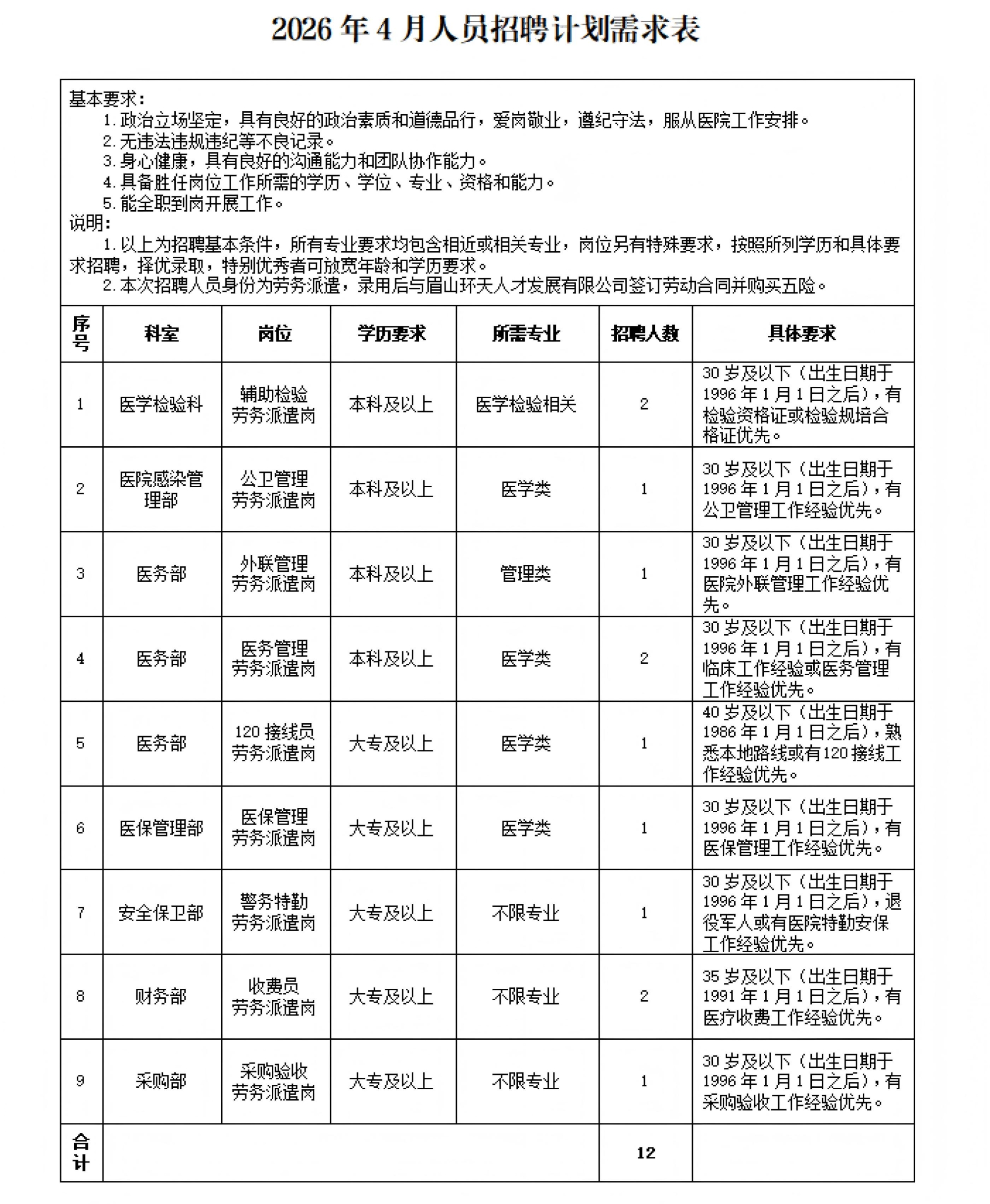 本次招聘人员身份为劳务派遣用工,录用后与眉山环天人才发展有限公司签订劳动合同并购买五险,由眉山环天人才发展有限公司派遣到西南医科大学附属天府医院工作。工作地点位于眉山天府新区视高街道环天府大道快速通道168号,西南医科大学附属天府医院。
