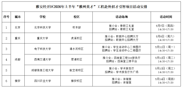 ①报名具体时间、地点详见《雅安经开区2026年上半年“雅州英才”工程赴外招才引智项目活动安排》。