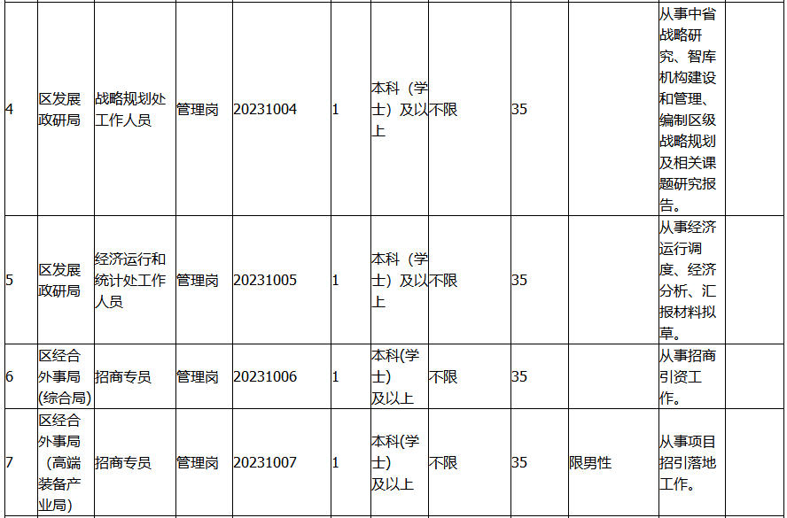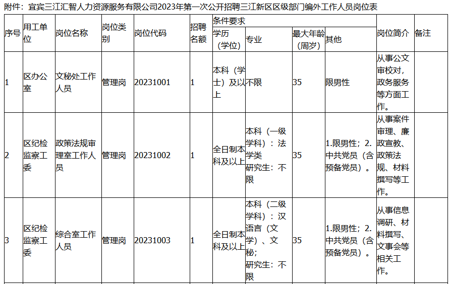 详见附件《三江新区2023年第一次公开招聘区级部门编外工作人员岗位表》,以下简称《岗位表》。