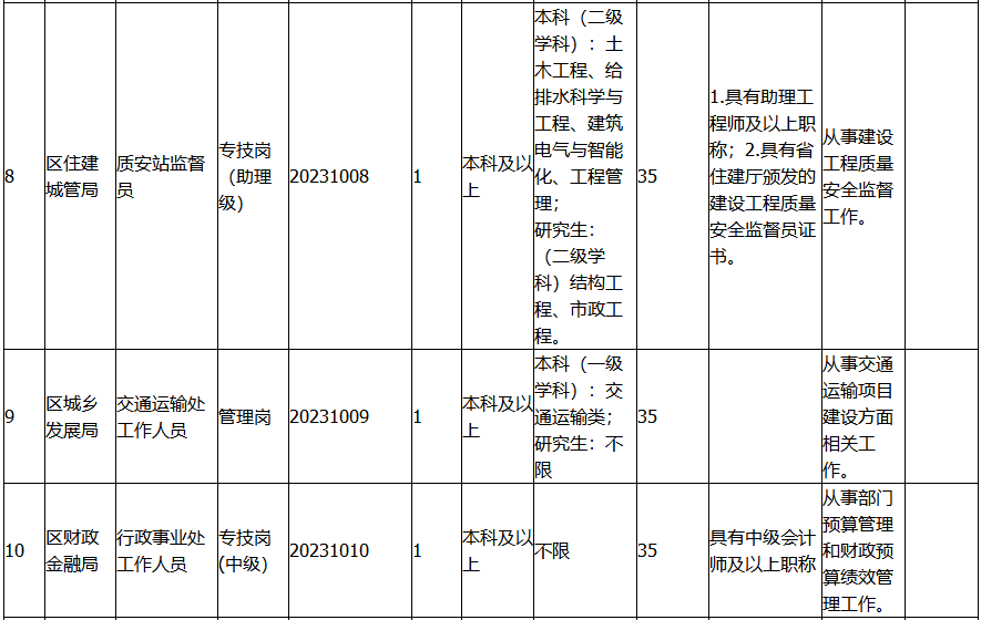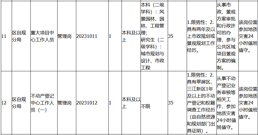 (3)具备本公告具体招聘岗位要求的条件和资格(详见岗位表)的社会在职和非在职人员(2023年应届毕业生不得报考),所有人员需在现场资格审查时提供相应的毕业证和学位证。年龄、工作年限等计算截止日期为此次招聘报名的第一日(例:“最大年龄:35周岁”,指截止此次招聘报名的第一日未满36周岁,以此类推)。